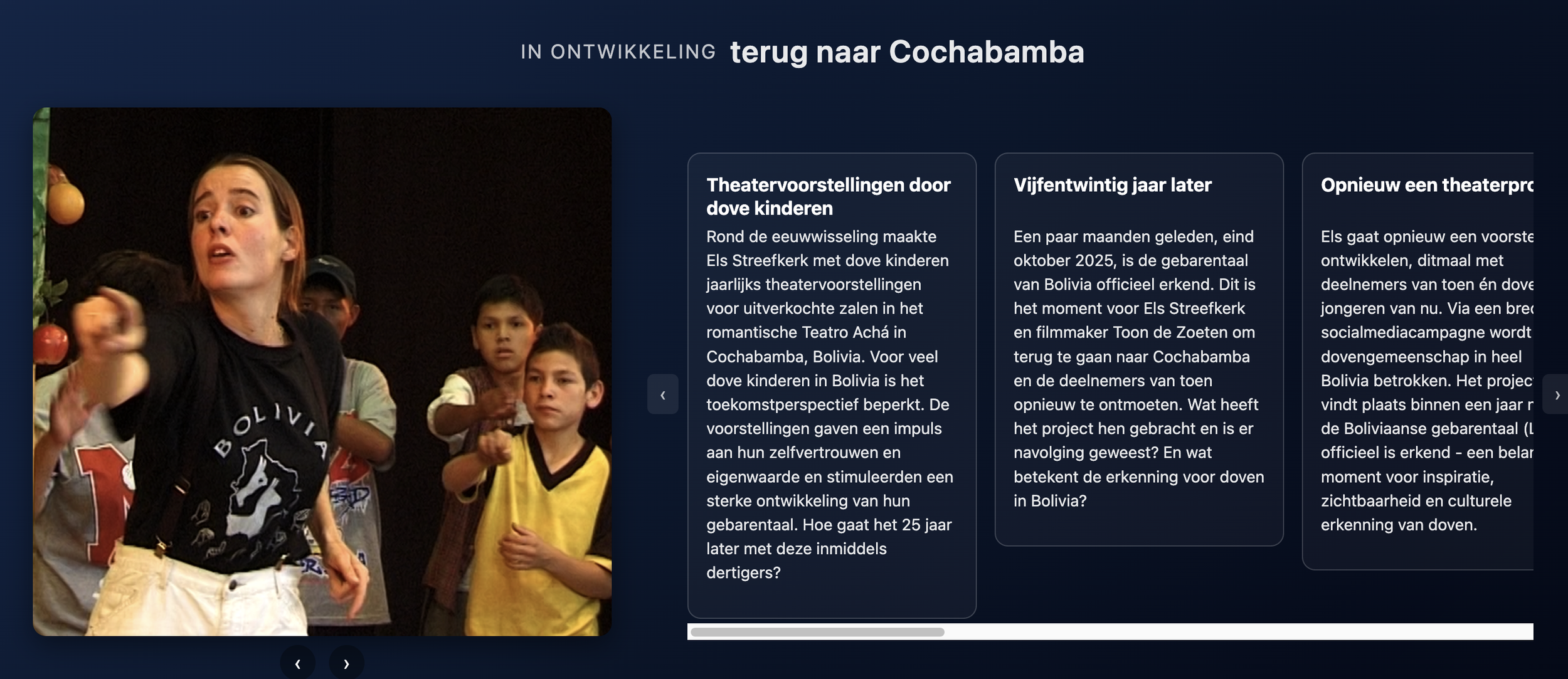 Ik ga met ‘de kinderen van toen’ opnieuw een voorstelling maken. Via een brede socialmediacampagne wordt dit project breed onder de aandacht gebracht. Het project vindt plaats binnen een jaar nadat de Boliviaanse gebarentaal (LSB) officieel is erkend - een belangrijk moment voor zichtbaarheid en culturele erkenning.